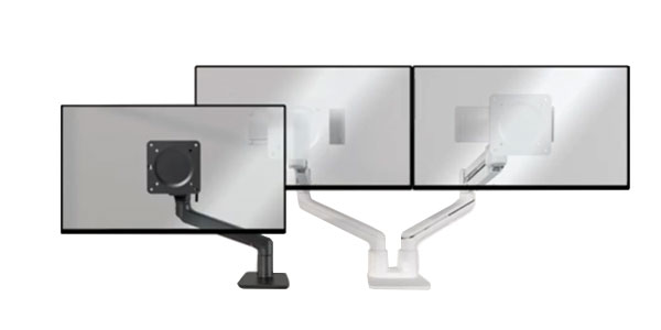 Monitorarme halten einen, zwei, drei oder sogar vier Bildschirme, schaffen dadurch wertvollen Platz auf dem Schreibtisch und integrieren sich nahtlos in jeden Arbeitsbereich.