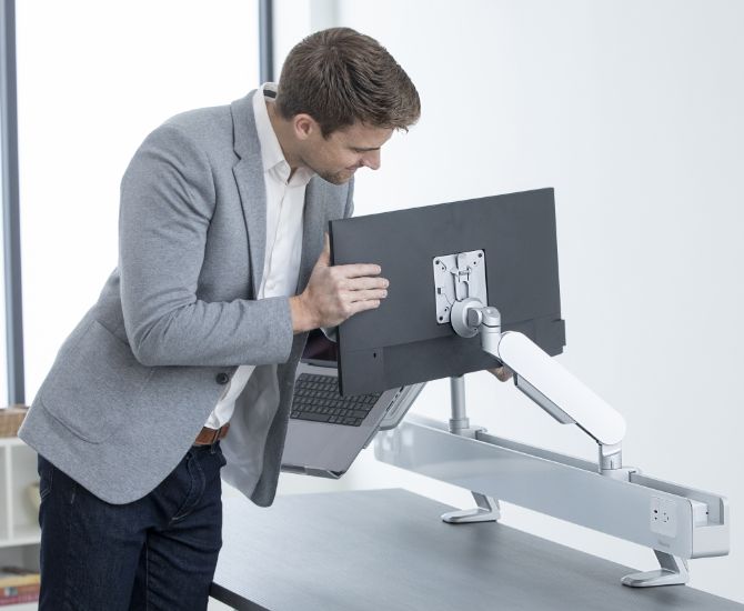 Intégration du bras pour écranRising™ et notre support pour ordinateur portable, , qui se fixent rapidement et facilement sur la barre grâce à notre technologie SnapKinect™. Rising Loft™ est conçu pour soutenir le flux de travail unique de chaque employé et s’adapte aisément aux besoins changeants, avec des options complémentaires telles que des pots à crayons, des étagères et un second module d’alimentation. Disponible en trois coloris et en trois tailles.