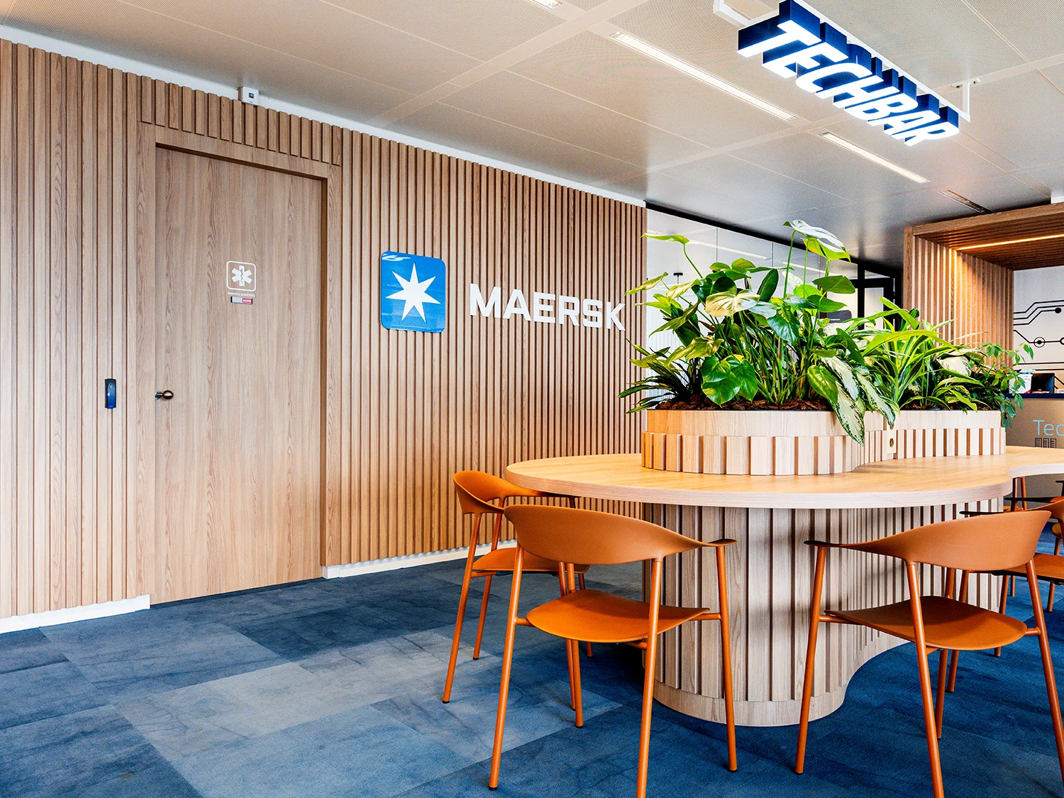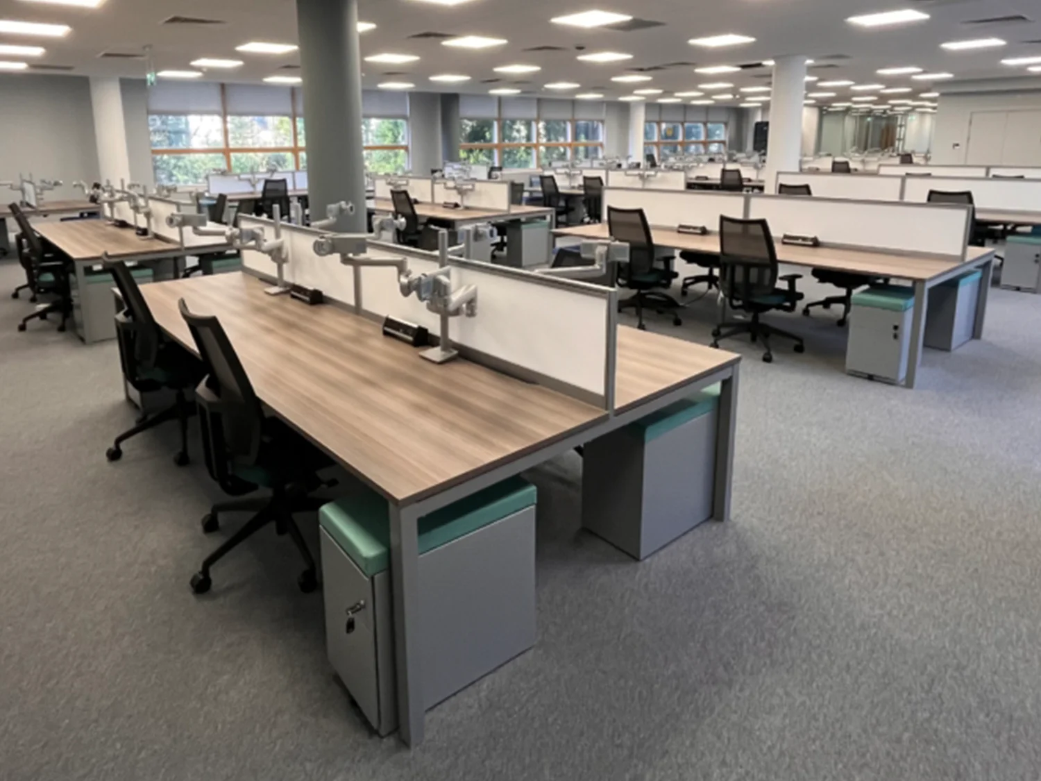 1200 Arbeitsplätze Ausstattung: Galaxy maßgefertigte Monitorarme, Desk Up 2.0 Elektrifizierungs- und Kabelmanagementlösungen