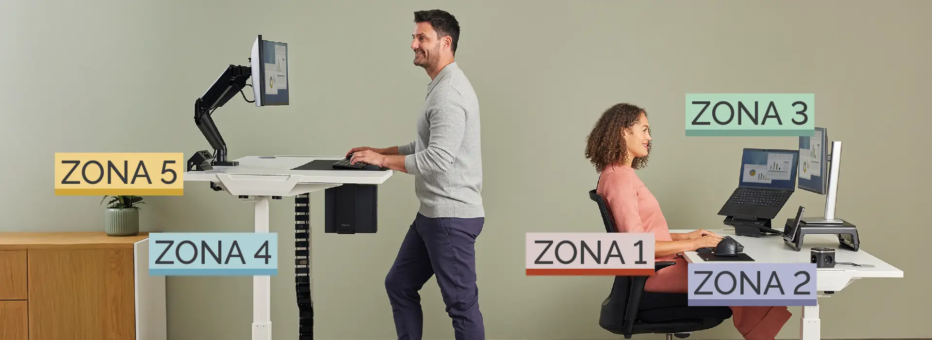 Transforma tu espacio de trabajo con el enfoque de las Zonas Ergonómicas de Fellowes™, diseñado para crear un entorno más saludable y productivo.