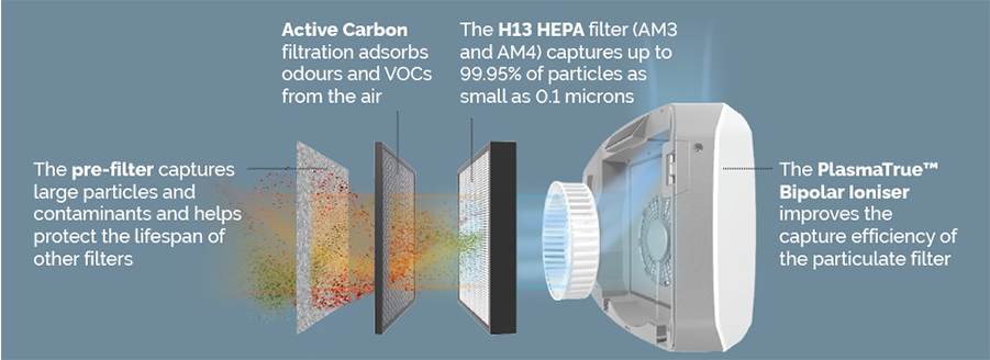 A good indoor air purifier with HEPA filtration can reduce the risk of virus and pollutant spread by removing nearly all (99.95 percent of) airborne particles at 0.3 microns3.