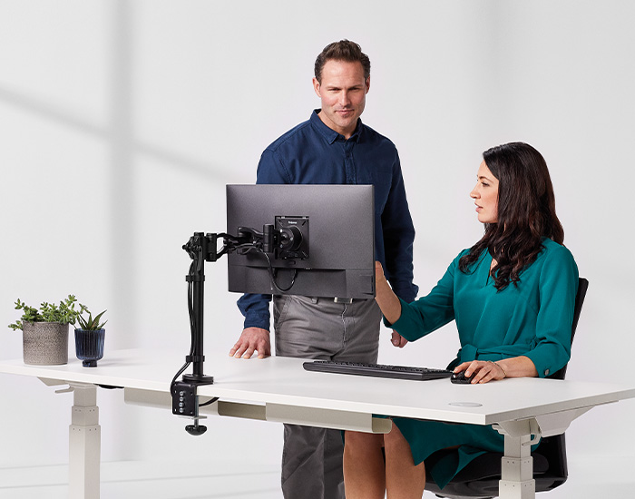 Experience greater freedom and space to thrive with our value monitor arm range. Easily adjust monitor height and depth for greater comfort and reduce eye, neck and back strain.
