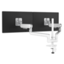 Image of a dual-arm monitor arm on a desk Image of a dual-arm monitor arm on a desk